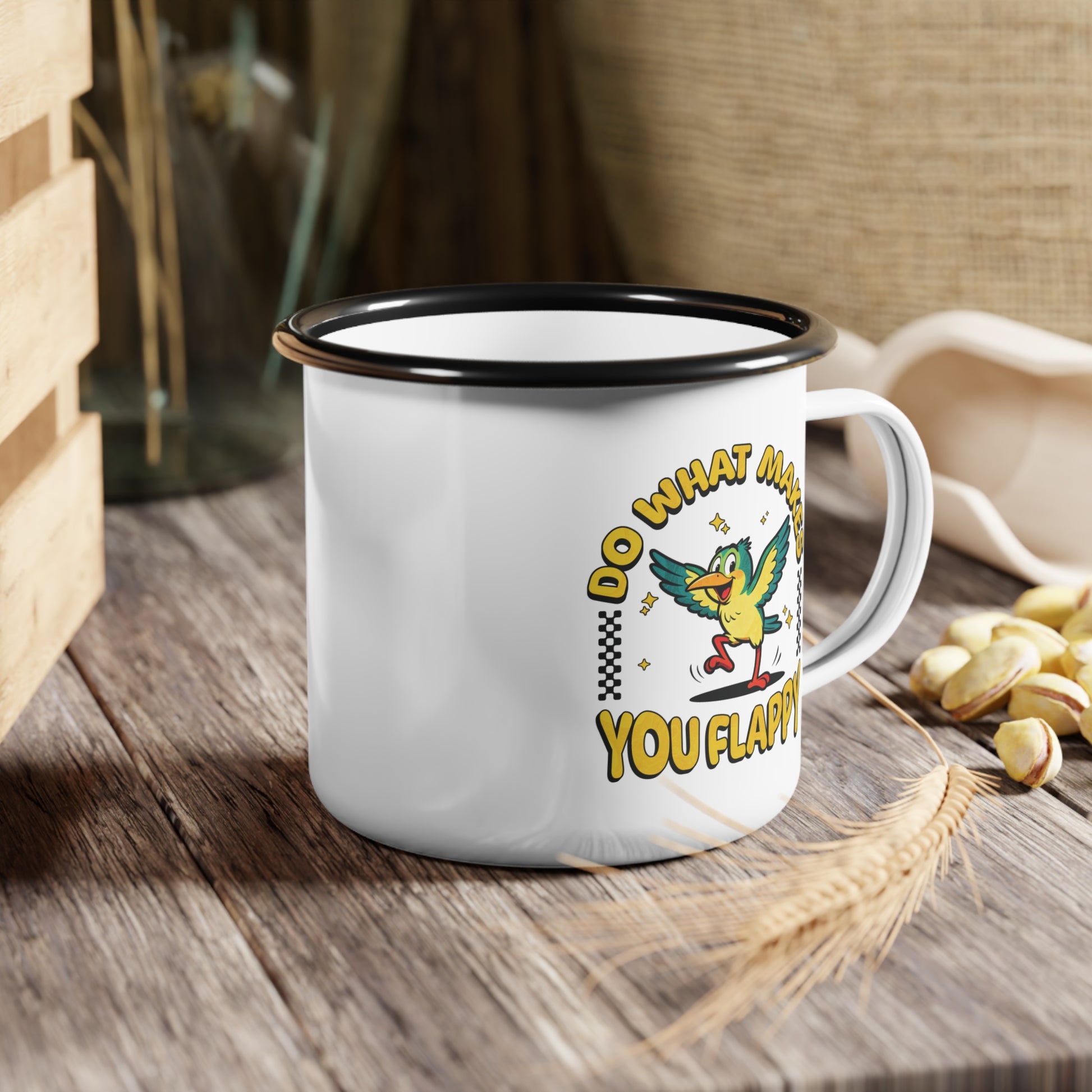 Take your joy on the go! This durable enamel mug is a happy reminder to "Do What Makes You Flappy," wherever you are.