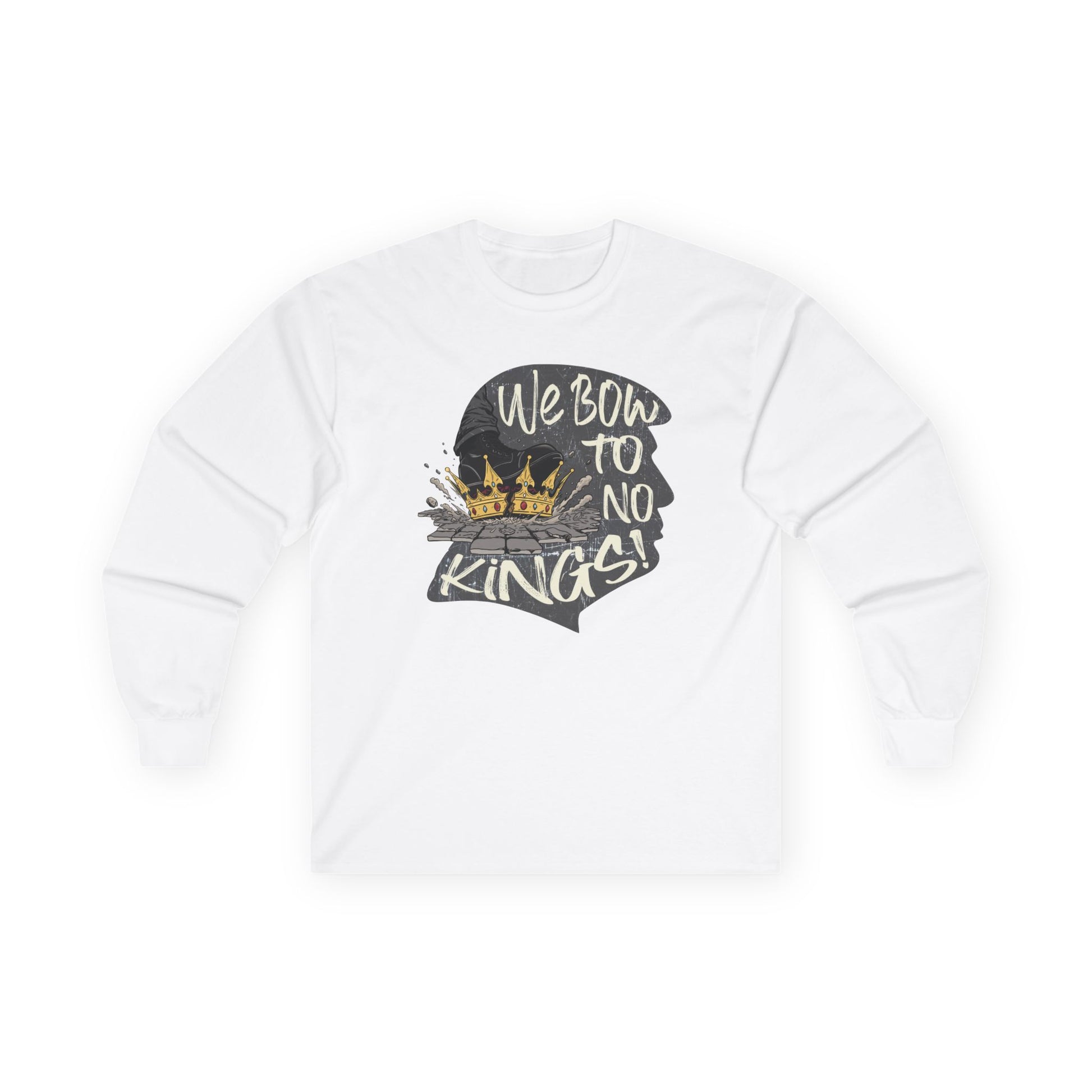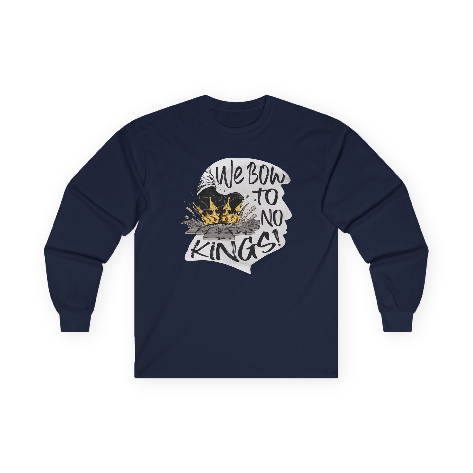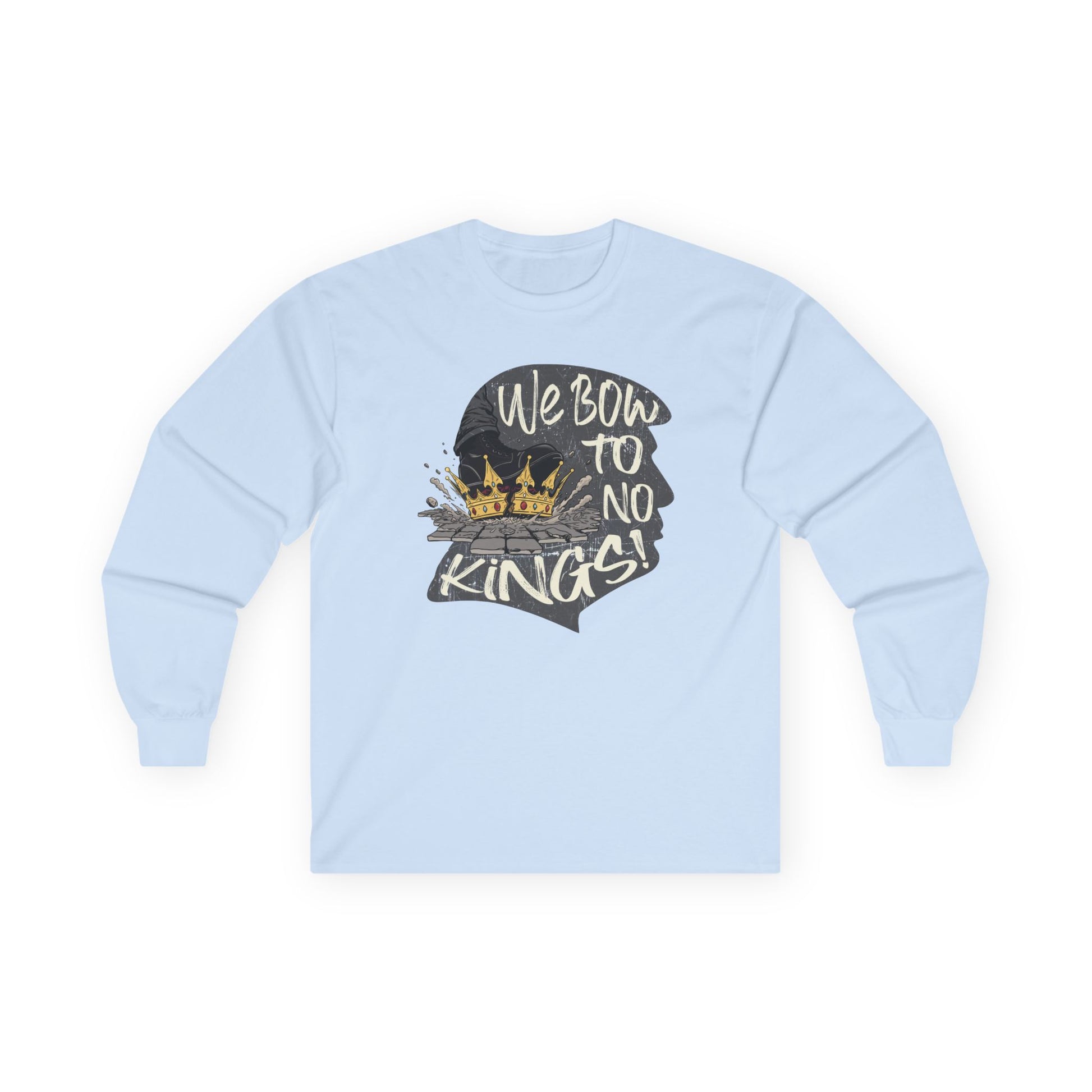 WE BOW TO NO KINGS. That silhouette? Yeah, we know who it is. It’s the face of the problem. We designed this in solidarity with the No Kings Protests because we’re fed up with the dictator-in-chief and of the current mis-administration. They’re not listening to the voice of the people. They’re too busy building walls and lining the pockets of their billion friends and the masked ICE cowards that are tearing families apart and disappearing our neighbors. Don't let the weather stop the movement! This long sleeve tee is perfect for cooler days of resisting the current administration. We bow to no kings, and we won't quit the fight. Keep the fire going, no matter the season.